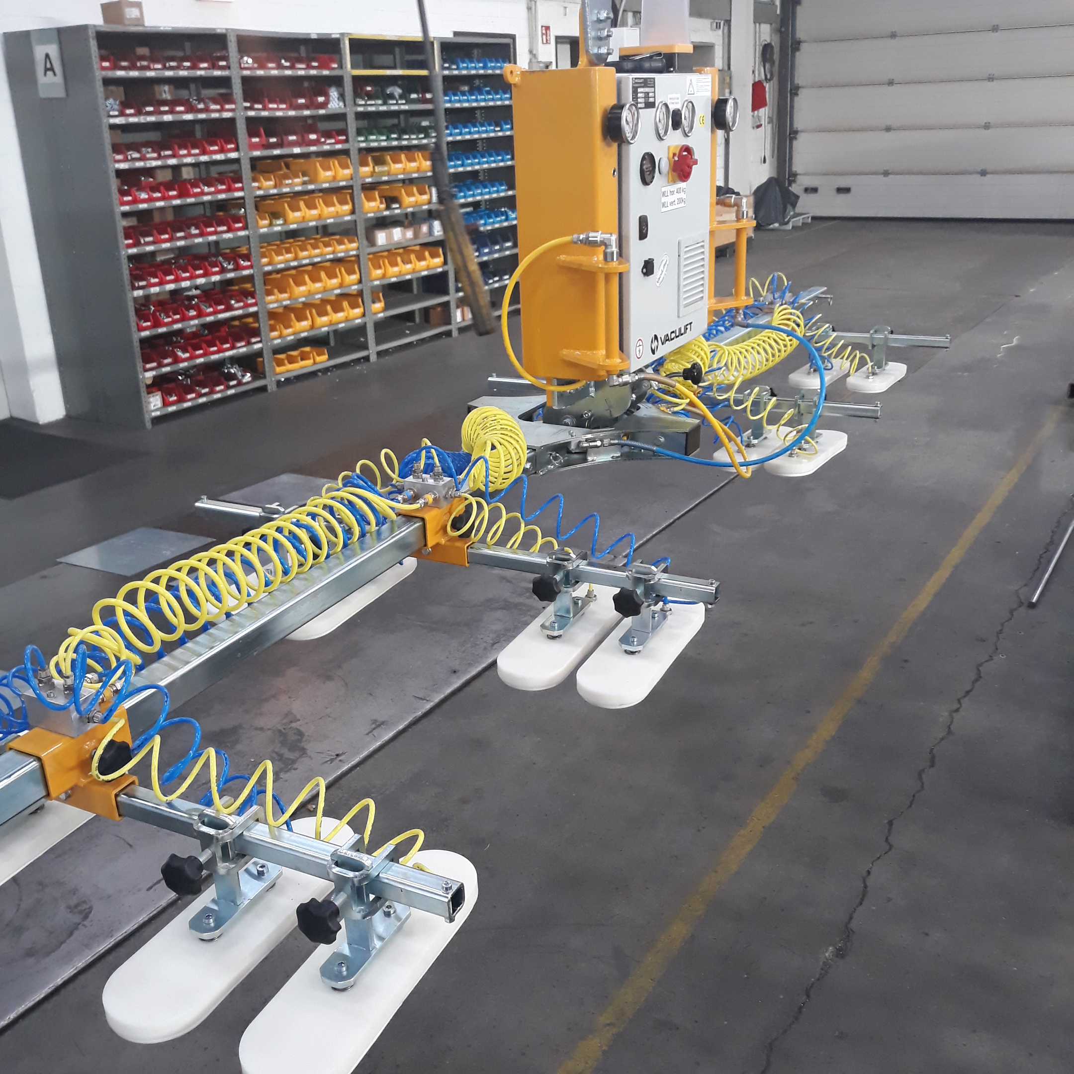 Equipement de levage simple d'utilisation, efficace et sûr, le palonnier à ventouses  assure le transport horizontal de vos différents types de tôle. Dépendant des options choisis, il peut aussi réaliser des basculements à 90° et manutentionner des panneaux allant jusqu'à 24 m de long.  C'est un système flexible car chaque traverses et ventouses peuvent être déplacées. Ces dernières peuvent même être remplacé un kit équivalent mais dédié à la manutention du verre. La centrale de vide quant à elle, reste la même. Cela évite aux clients de devoir investir dans 2 équipements et réduit naturellement le coût d'investissement.